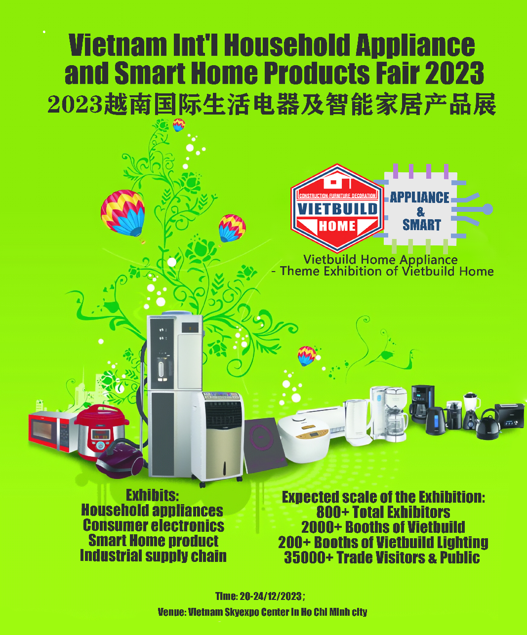 Activities held simultaneously 同期活动2023VIETBUILD HOME越南国际家居用品博览会 2023越南-中国生活电器及智能家居产品供需贸易对接会2023越南-中国家电制造业上游供应链OEM合作对接会Expected scale of the Exhibition预计举办规模:800+ Total Exhibitors / 800+参展商